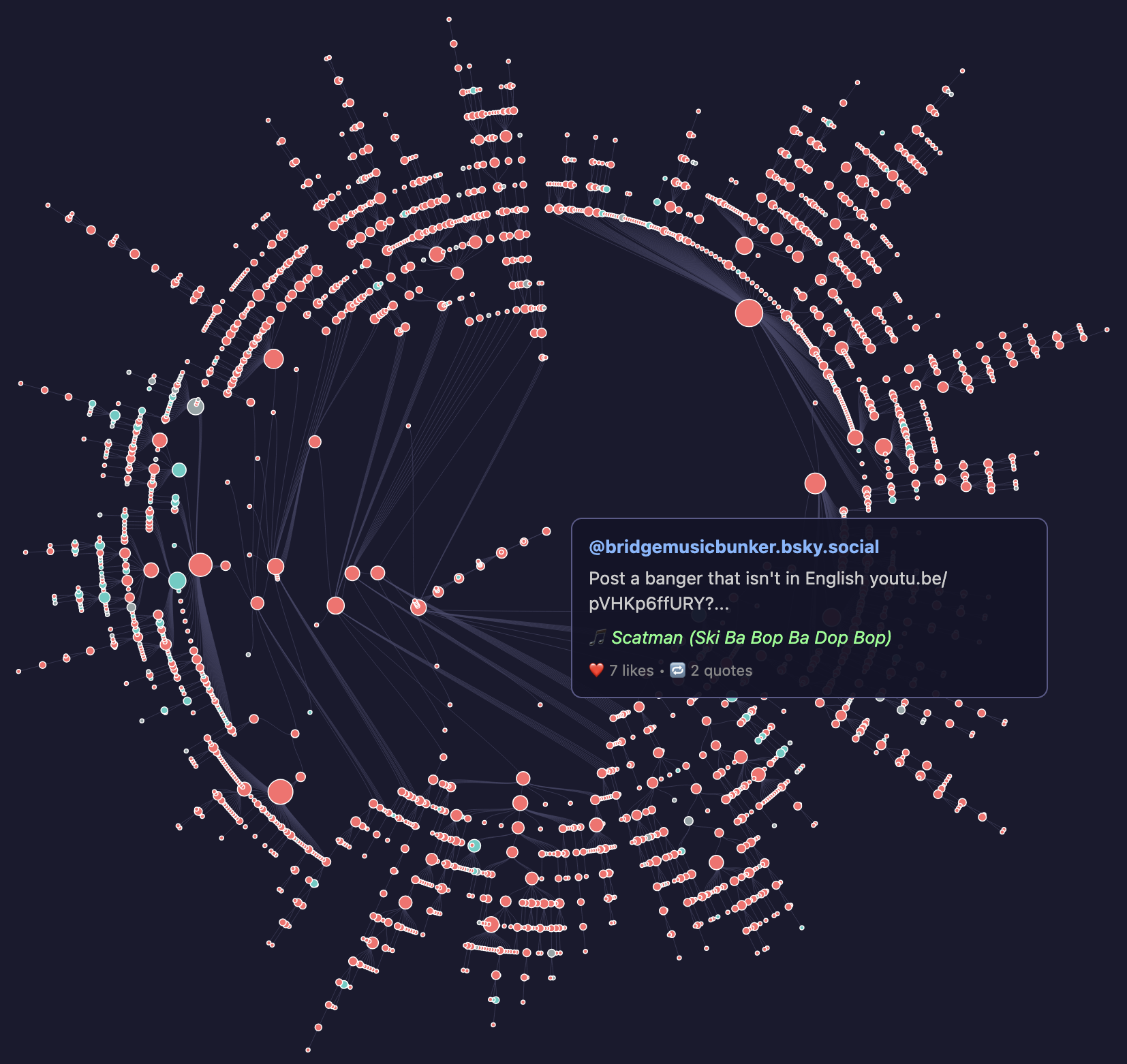 The bsky UI makes it pretty hard to navigate the tree of "skeets" and "quote skeets" (I still can't say these phrases seriously...) which got me wondering what the tree of posts actually looks like.